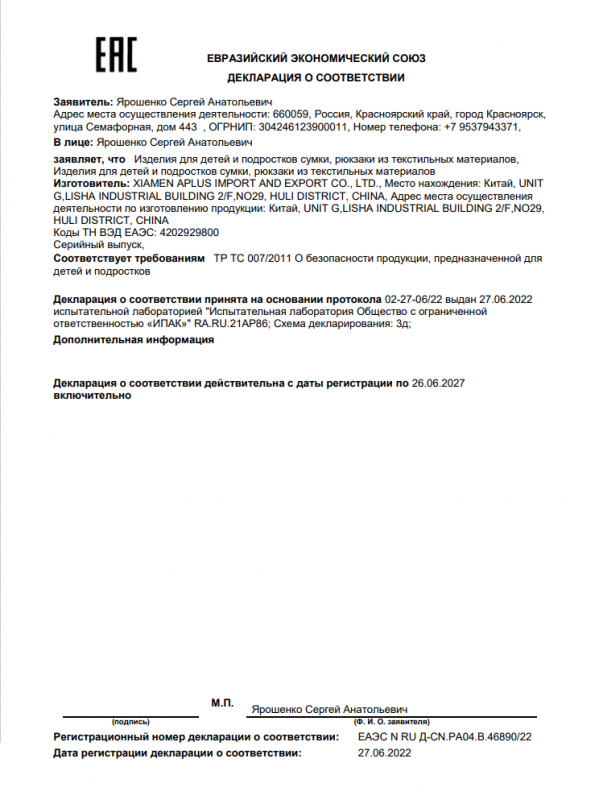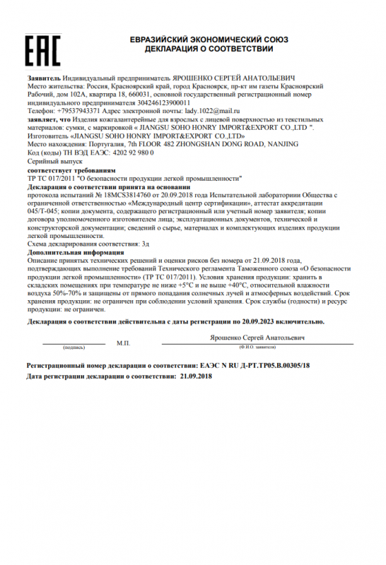 Декларация о соответствии (Сумки, рюкзаки из текстильных материалов)