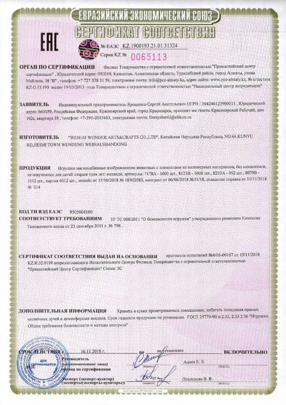 Сертификат соответствия на игрушки мягконабивные