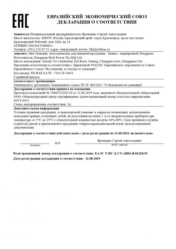 Декларация о соответствии (Упаковка металлическая)