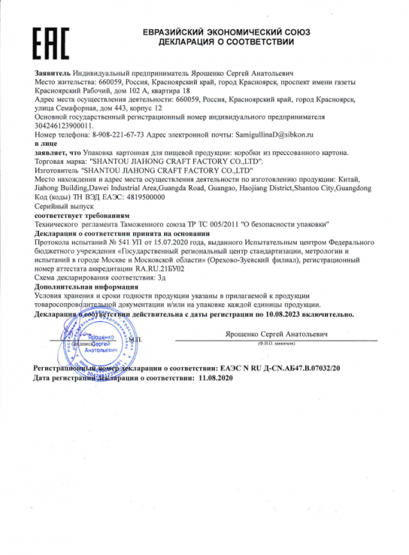 Декларация о соответствии (Упаковка картонная)